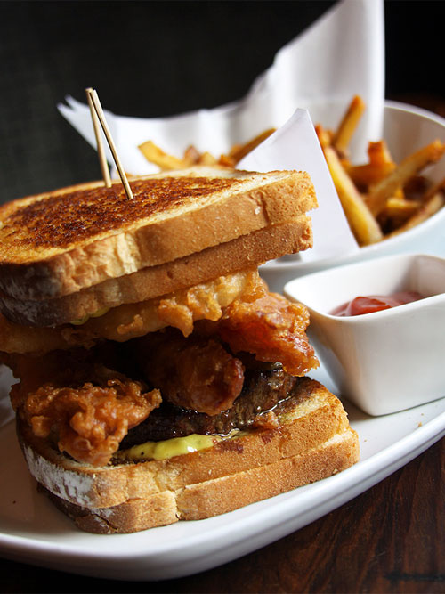 Because you might need one. A 3/4 pound patty of ground chuck. Prime. Deep fried bacon. And onion rings. Sandwiched between two grilled cheese sandwiches. One cheddar and one swiss. It’s called the triple bypass burger, well at least it WAS (I think it’s death on a bun now). I think this started with one of those huge ridiculous burger king breakfast sandwiches. Then there was deep fried everything at the state fairs. Don’t forget the sandwich served between two chicken breasts. And the one served between two Krispy Kreme donuts. Now we have this. . Sigh. But you know somebody ordered it, right? And liked it. Sigh. Sigh. I hope they have good health insurance.
