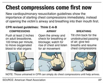 The American Heart Association has issued new guidelines for administering CPR, in light of the fact that chest compressions are especially helpful because they keep the blood circulating. The old method called for clearing airway obstructions and administering mouth to mouth resuscitation, but recently CPR administered strictly by hand has been found to save more lives in cardiac arrest situations.