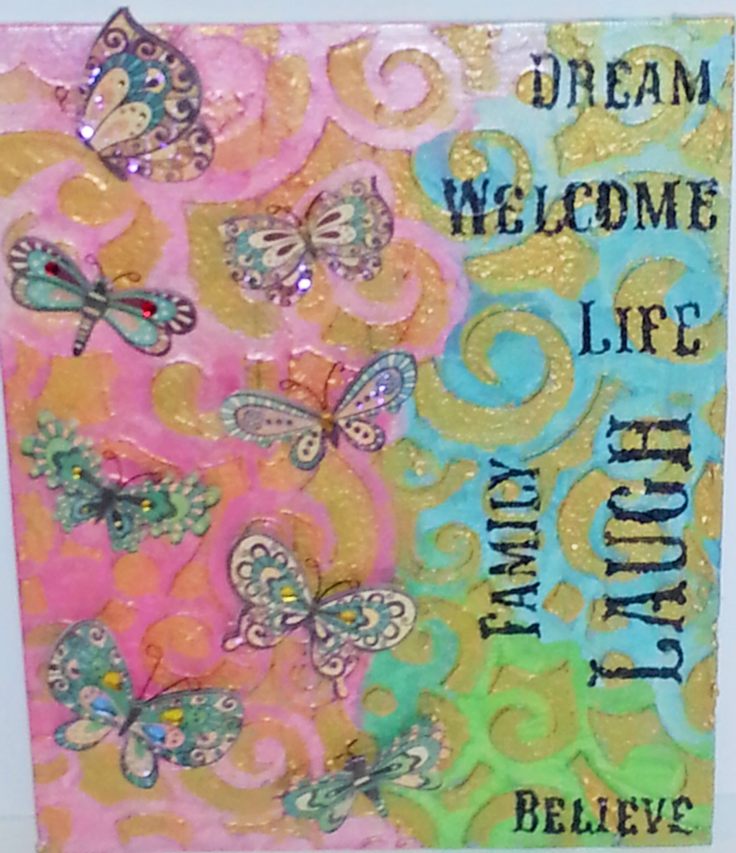 This week I am adding words to my piece. Since we have already done texture, color and subject, a big part of this step is finding somewhere to put words. I thought my most serious obstacle to overcome would be choosing the best words, but with all of the activity involved with Thanksgiving, my biggest challenge has been sitting still long enough to get things done.