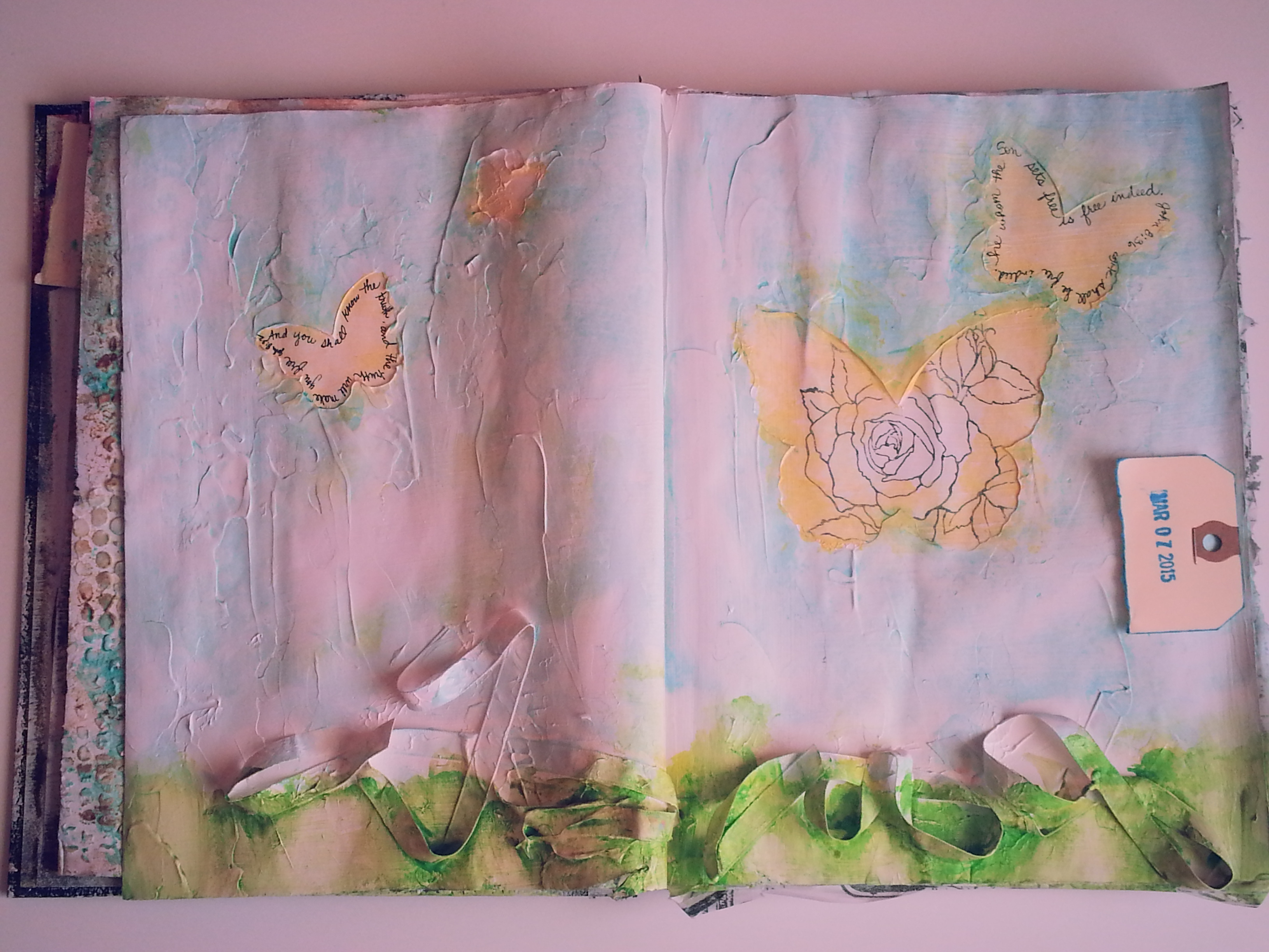 Spring has been really motivating me lately. I have been out walking and enjoying the fresh air and sunshine, so that when Spring is officially here, I will be prepared. The thing about art, though, is that one has to sit still in order to turn those ideas and emotions into something spectacular and the weather has been far too beautiful for that. Donna Downey used joint compound, but I used super heavy gesso because I had some on hand and there was no telling when I would have made it to a hardware store. The fact that I personally feel that it is the stuff dreams are made of didn’t hurt, either. It is like frosting with no calories and who can beat that?