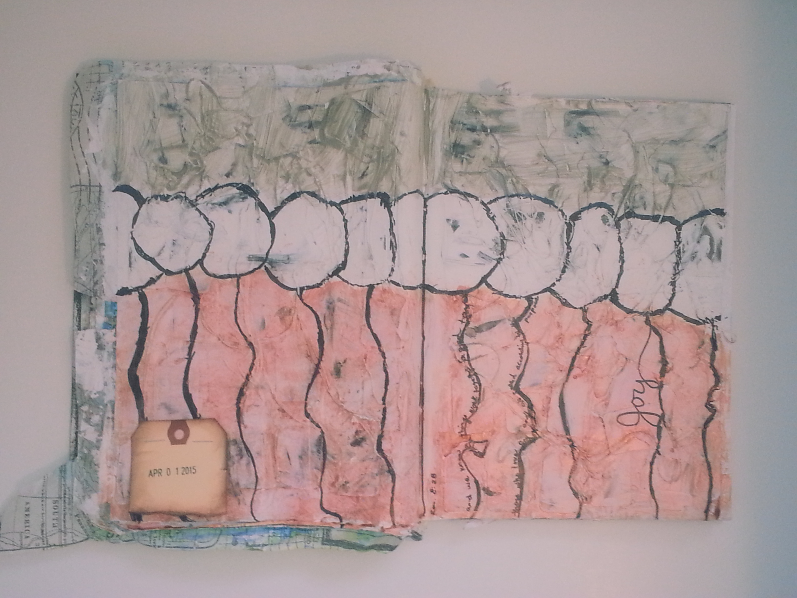 This art journal entry was an interesting journey. It involved spray painting and embedding these little tags with string on them in super heavy gesso and then painting them. I had a hard time deciding what to do with the string and once I got past that challenge, it felt like it took forever to dry completely (almost two days, which for one layer is a long time for a piece of this size). The actual painting was the easiest part, lol. I learned a lot of new things and even if I did not, I played with super heavy gesso, and that is always a win.