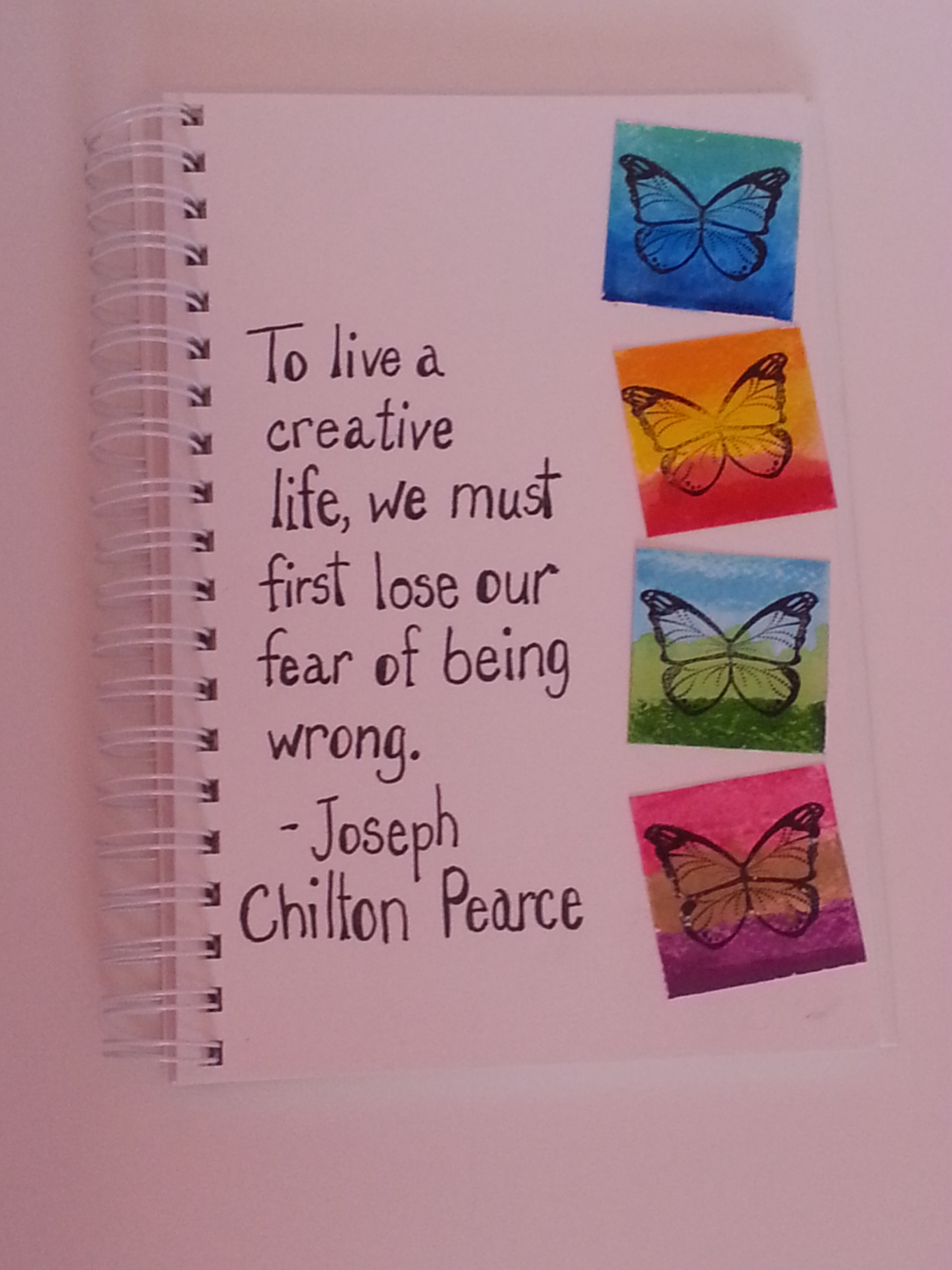 to super heavy gesso) and a quote by Joseph Chilton Pearce, “To live a creative life, we must lose our fear of being wrong.” Every day I try just a little bit harder to be less fearful and more creative. I used double scoop gelatos by Faber-Castell and water to color the backgrounds for my butterflies. I’ll have to incorporate them into another project soon because I always have fun working with them 🙂